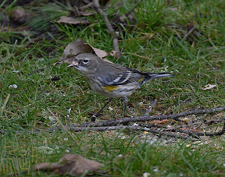 "It's me, Yellow-rumped Warbler (Myrtle Warbler). These chunks of suet are scrumptious. I need to swallow before the hungry Starlings raid here."
